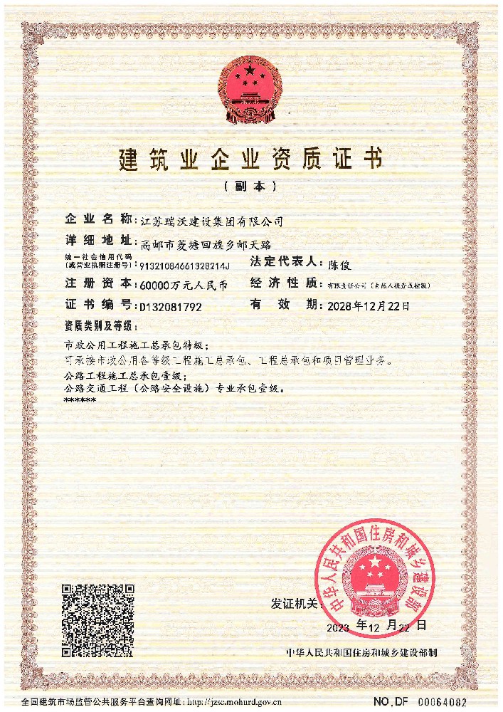 江蘇瑞沃建設集團有限公司成立于2007年,是一家以市政、交通工程建設為主導,集房屋建筑、交通安全設施、城市道路照明工程、電力工程、隧道工程、航道工程及投融資為一體的綜合性企業。企業注冊資本60000萬元,現有各類技術人員580人,其中中、高級以上人員498人,注冊類人員268人,一、二級建造師166人。公司榮獲“江蘇省建筑業優(yōu)秀企業”、“江蘇省五一勞動獎狀”,連續多年被評為“揚州市先進企業”、“江蘇省建筑業百強企業”,連續八年蟬聯百強企業基礎設施類第一名。